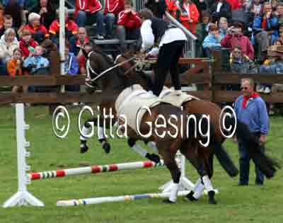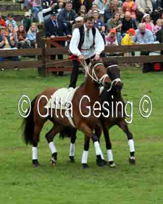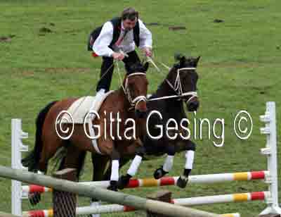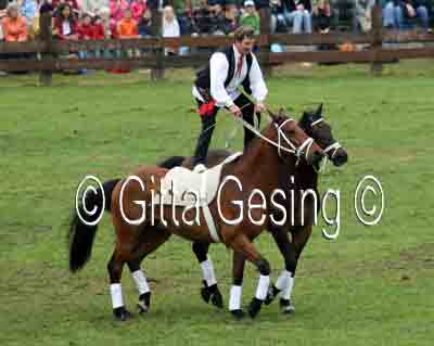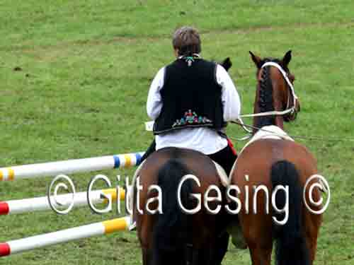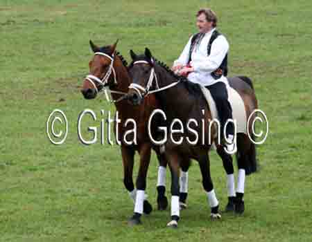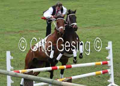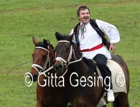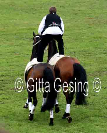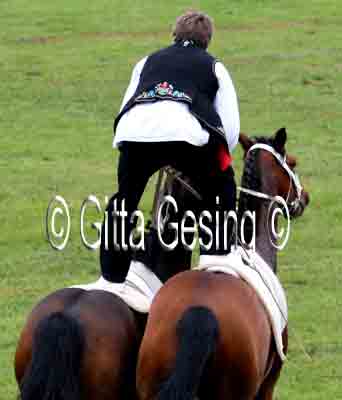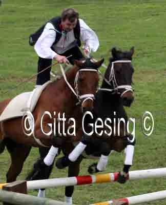 60010367 Seit etwa 15 Jahren sprang er als ungarischer Postreiter mit den beiden Pferden! |