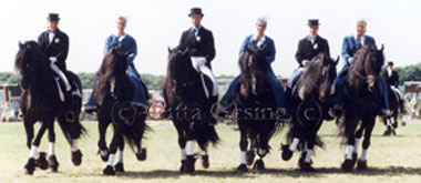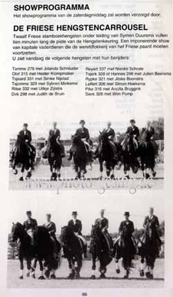 DE FRIESE HENGSTENCARROUSEL 1996 Tamme 276 mit Jolanda Schreuder - Olof 315 mit Hester Klompmaker - Tsjeard 331 mit Simke Nijstadt - Tsjomme 329 mit Sybren Minkema - Ritse 332 mit Uilkje Zijlstra - Dirk 298 mit Judith de Bruin Reyert 337 mit Nienke Schrale - Tsjerk 328 of Hannes 296 mit Julien Beersma - Rypke 321 mit Jitske Boonstra - Leffert 306 mit Simon Hoeksma - Pike 316 mit Ancilla Brugink - Sierk 326 mit Wim Pomp Mehr dazu in "Show & Event" - "News & Archiv" und auf meinen analogen Seiten mit den Friesen- Stammbuch-Hengsten |
