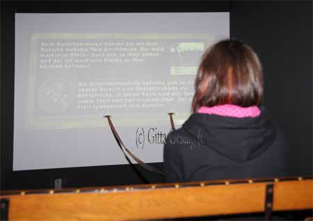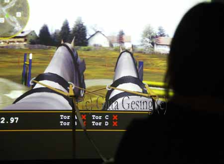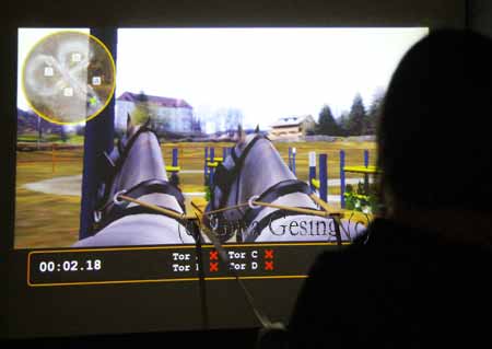 Das Westfälische Pferdemuseum hatte eine neue Attraktion - die Besucher dürfen selber die Zügel in die Hand nehmen und einen Zweispänner durch einen Parcours lenken - dafür dient eine Wand auf der ein Film läuft |