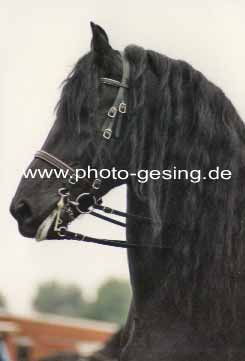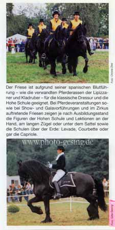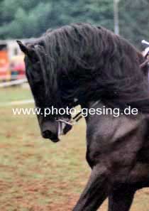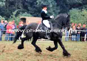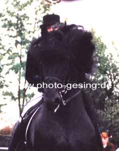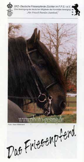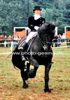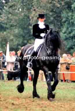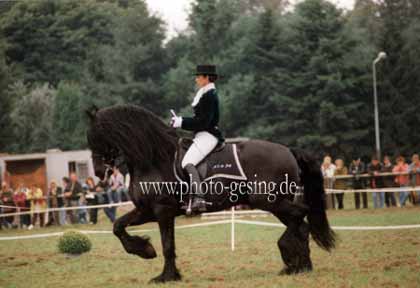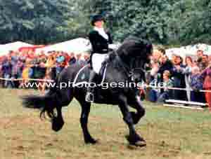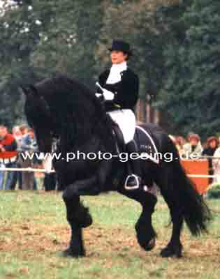 ![]() Martina de Jong auf "Gerlof 254" in Unna 1994 danach wurde er nach Amerika verkauft 1999 wurde das Foto im Flyer des Deutschen Friesenpferde Zuchtverband (DFZ) zusammen mit dem Niederländischen Zuchtverband (KFPS) veröffentlicht |
