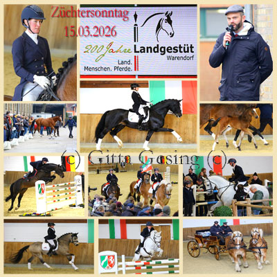 2026 227 > 15.03.2026 - Warendorf (D) - NRW Landgestüt 200j. Jubiläum - Züchtersonntag - Hengstpräsentation - 2 neue Reitponyhengste 2025 226 > 02.12.2025 - Münster (D) - Westf. Pferdestammbuch e.V. - 35. Westfälische Hauptkörung 2j. Reitpferdehengste heute Auktion Dr.+ Spr. 225 > 08.11.2025 - Dortmund (D) - Messe - 17.x ab 2006 Hund und Pferd - Westfalenhallen - Start 2006 siehe hier ganz unten 224 > 05.10.2025 - Münster (D) - Westfälischen Pferdestammbuch e.V. - Herbst-Auktion - OnLive - Online + Live vor Ort 223 > 27.09.2025 - Warendorf (D) - NRW Landgestüt - 74. Hengstparade 2.x Parade bei Nacht 222 > 20.04.2025 - Münster (D) - 4.x Cavalluna - Grand Moments - Ostern 221 > 06.04.2025 - Münster (D) - Westfälischen Pferdestammbuch e.V. - Frühjahrs-Auktion - Sonntag - OnLive - Online + Live vor Ort 220 > 16.03.2025 - Warendorf (D) - NRW Landgestüt - Züchtersonntag - Hengstpräsentation - 2.x Reitponyhengste 2024 219 > 03.12.2024 - Münster (D) - Westf. Pferdestammbuch e.V. - 34. Westfälische Hauptkörung 2j. Reitpferdehengste + Auktion Dr.+ Spr. Ehrengast heute Ingrid Klimke - Olympiasiegerin und Weltmeisterin im Vielseitigkeitsreiten 218 > 02.12.2024 - Münster (D) - Westf. Pferdestammbuch e.V. - 34. Westfälische Hauptkörung 2j. Reitpferdehengste Dressur-/Springbetont 217 > 09.11.2024 - Dortmund (D) - Messe - 16.x ab 2006 Hund und Pferd - Westfalenhallen - Start 2006 siehe hier ganz unten 216 > 29.09.2024 - Münster (D) - Westfälischen Pferdestammbuch e.V. - Herbst-Auktion ab 14 Uhr heute nur Dressurbetonte Pferde + OnLive 215 > 21.09.2024 - Warendorf (D) - NRW Landgestüt - 73. Hengstparade 1.x Parade bei Nacht 214 > 13.07.2024 - Münster (D) - Westfälischen Pferdestammbuch e.V. - 120j.+100j. Jubiläum - Pferdezucht/Pferdesport Verbände Abendgala 213 > 14.04.2024 - Münster (D) - Westfälischen Pferdestammbuch e.V. - Frühjahrs-Auktion - Sonntag - OnLive - Online + Live vor Ort 212 > 31.03.2024 - Münster (D) - 4.x Cavalluna - Land der Tausend Träume - Ostern 211 > 17.03.2024 - Warendorf (D) - NRW Landgestüt - Züchtersonntag - Hengstpräsentation - NEU 1.x Fohlen - NEU 1.x Reitponyhengste - NEU 1.x Neue Leiterin der Deutschen Reitschule im NRW Landgestüt Warendorf 210 > 03.03.2024 - Münster (D) - Westf. Pferdestammbuch e.V. - Westfälische OnLive Hengstschau für Reitpferde + Reitpony 2023 209 > 06.12.2023 - Münster (D) - Westf. Pferdestammbuch e.V. - 33. Westfälische Hauptkörung 2j. Reitpferdehengste Springbetont 208 > 04.12.2023 - Münster (D) - Westf. Pferdestammbuch e.V. - 34. Westfälische Hauptkörung 2j. Reitpferdehengste Dressurbetont 207 > 04.11.2023 - Dortmund (D) - Messe - 15. Hund und Pferd - Westfalenhallen - 1.x nach 3 Jahren Corona Virus/Covid19 Pause ab 2020 206 > 30.09.2023 - Münster (D) - Westfälischen Pferdestammbuch e.V. - Herbst-Auktion - NEU 1.x Samstagabend ab 18 Uhr + OnLive 205 > 16.09.2023 - Warendorf (D) - NRW Landgestüt - 72. Hengstparade 204 > 08.04.2023 - Münster (D) - 3.x Cavalluna - Geheimnis der Ewigkeit - Ostern 203 > 31.03.2023 - Münster (D) - Westfälischen Pferdestammbuch e.V. - Frühjahrs-Auktion - NEU 1.x Freitagabend ab 18 Uhr + OnLive 202 > 26.03.2023 - Warendorf (D) - NRW Landgestüt - Züchtersonntag - Hengstpräsentation 201 > 05.03.2023 - Münster (D) - Westf. Pferdestammbuch e.V. - Westfälische OnLive Hengstschau für Reitpferde + Reitpony 2022 Corona Virus/Covid19 Weltweit - 1.x wieder Events mit Zuschauer vor Ort 200 > 07.12.2022 - Münster (D) - Westf. Pferdestammbuch e.V. - 32. Westfälische Hauptkörung 2j. Reitpferdehengste Springbetont 199 > 05.12.2022 - Münster (D) - Westf. Pferdestammbuch e.V. - 32. Westfälische Hauptkörung 2j. Reitpferdehengste Dressurbetont 198 > 10.09.2022 - Warendorf (D) - NRW Landgestüt - 71. Hengstparade - Dr. Felix Austermann - Neuer Landgestüts Leiter ab 15.03.2022 - Ehrengast Silke Gorißen Ministerin für Landwirtschaft + Verbraucherschutz des Landes Nordrhein-Westfalen eröffnete die Show 197 > 26.08.2022 - Warendorf (D) - NRW Landgestüt - 17. Symphonie der Hengste - Kölner Symphoniker - A very British Night of Crime - Dr. Felix Austermann - Neuer Landgestüts Leiter ab 15.03.2022 196 > 18.04.2022 - Münster (D) - 2.x ab 2019 Cavalluna - Legende der Wüste - Ostern 2021 Corona Virus/Covid19 Weltweit - Keine Events mit Zuschauern Am 28.01.2020 wurde der 1. Corona/Covid19 Fall in Deutschland bestätigt. Ab 11. April 2022 endeten fast alle Corona-Regeln. In Deutschland starben bis Ende 2022 mit/an Covid 19 erkrankte über 150 Tausend Menschen - Weltweit starben über 5 Millionen Menschen - Ab Oktober 2023 war neuer Impfstoff für die 5. Corona Impfung da. 2020 Corona Virus/Covid19 Weltweit - Keine Events mit Zuschauern 195 > 23.02.2020 - Münster (D) - NRW Landgestüt Warendorf - Hengstschau im Westfälischen Pferdestammbuch e.V. 194 > 19.01.2020 - Münster (D) - Westfälisches Pferdestammbuch e.V. - 26. Westfälische Winter Auktion 2019 193 > 12.10.2019 - Dortmund (D) - Messe - 14. Hund und Pferd - Westfalenhallen 192 > 06.10.2019 - Münster (D) - Westfälischen Pferdestammbuch e.V. - 58. Westfälische Elite Auktion 191 > 14.09.2019 - Warendorf (D) - NRW Landgestüt - 70. Hengstparade - 3 Gestütsmitarbeiter je 40j. Dienstjubiläum - klicken Sie hier >>> https://pferdekalender-online.de/wandkalender/203/gestuetsimpressionen-warendorf-2020?c=38 - NRW Landgestüt Warendorf HURRICAN liebevoll gemalt von Christina Bötzel nach Fotovorlage als Specialgast in Vererberlegenden - klicken Sie hier >>> https://pferdekalender-online.de/wandkalender/198/vererberlegenden-2020?c=38 190 > 09.08.2019 - Warendorf (D) - NRW Landgestüt - 16. Symphonie der Hengste - Kölner Symphoniker - A Night on Broadway 189 > 16.06.2019 - Münster (D) - Westf. Pferdestammbuch e.V. - 15. Westfälische Sommer-Auktion 188 > 21.04.2019 - Münster (D) - NEU 1.x ab 2019 Cavalluna - vorher 15.x Apassionata - Welt der Fantasie - Ostern 187 > 14.04.2019 - Münster (D) - Westf. Pferdemuseum + Hippomaxx Ar