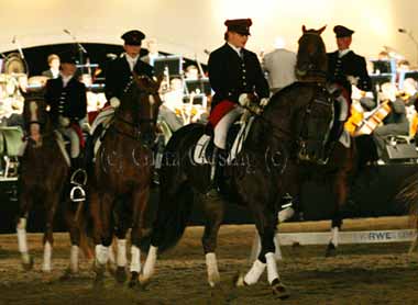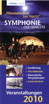 "Symphonie der Hengste" - Filmmelodien bei Nacht - 6. August 2010 Wieder zog es mich nach Warendorf in das Landgestüt, dieses Mal zu einem Event bei Nacht. Mal etwas ganz anderes, Pferde unter freiem Himmel bei Nacht. Am Tag schien die Sonne, es war warm, so um die 28 Grad, der Tag neigte sich dem Ende zu, der Abend versprach schön zu werden. Einlass war ab 18 Uhr. Pünktlich um 20 Uhr fuhr die Kutsche, gezogen von 2 Warmbluthengsten herein, darin saßen die Gestütsleiterin Susanne Schmitt-Rimkus, der Bürgermeister von Warendorf, sowie die Sopranistin und der Orchesterleiter. Nach der herzlichen Ansprache in der großen Orchestermuschel an die Ehrengäste und das Publikum, ritt Nicole Uphoff-Selke mit "Pascavello" ein. Sie gehört schon mit zum lebenden Inventar dazu. Zur Live-Musik tanzten die Hengste und verzauberten jeden. Gegen 21 Uhr begann eine Pause, im Innenhof entdeckte ich auf den Tischen die Speisen und Getränkekarten. Darin standen Menüs unter dem Namen "Star Trek", das waren Flusskrebsschwänze in Trüffelmajonaise an Salatspitzen mit Crosstinis oder "Titanic", Gekräutertes Schweinefilet in Barolojus mit sommerlichem Gemüse und Rosmarin - Kartoffeln oder "Phantom der Oper", Wiesenpilze ... und viele mehr. Das waren die Filmmelodien bei Nacht, tolle Idee. |